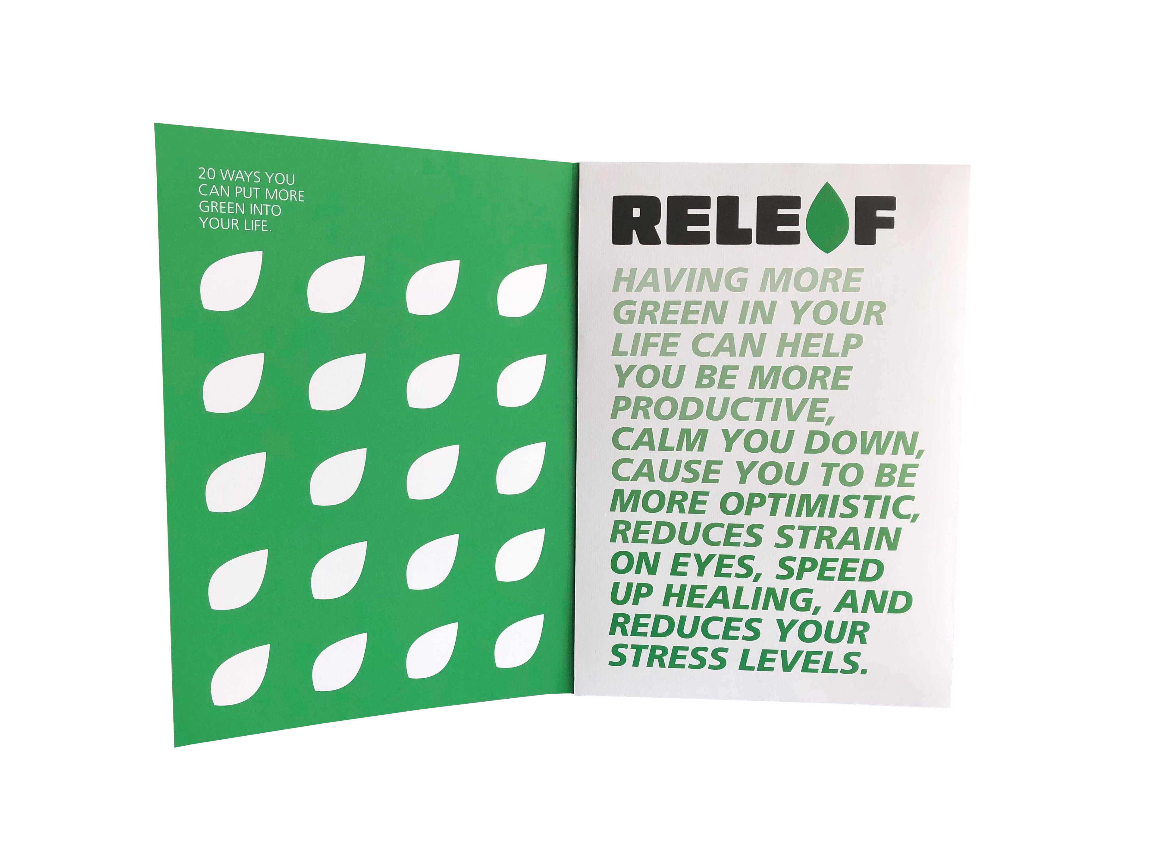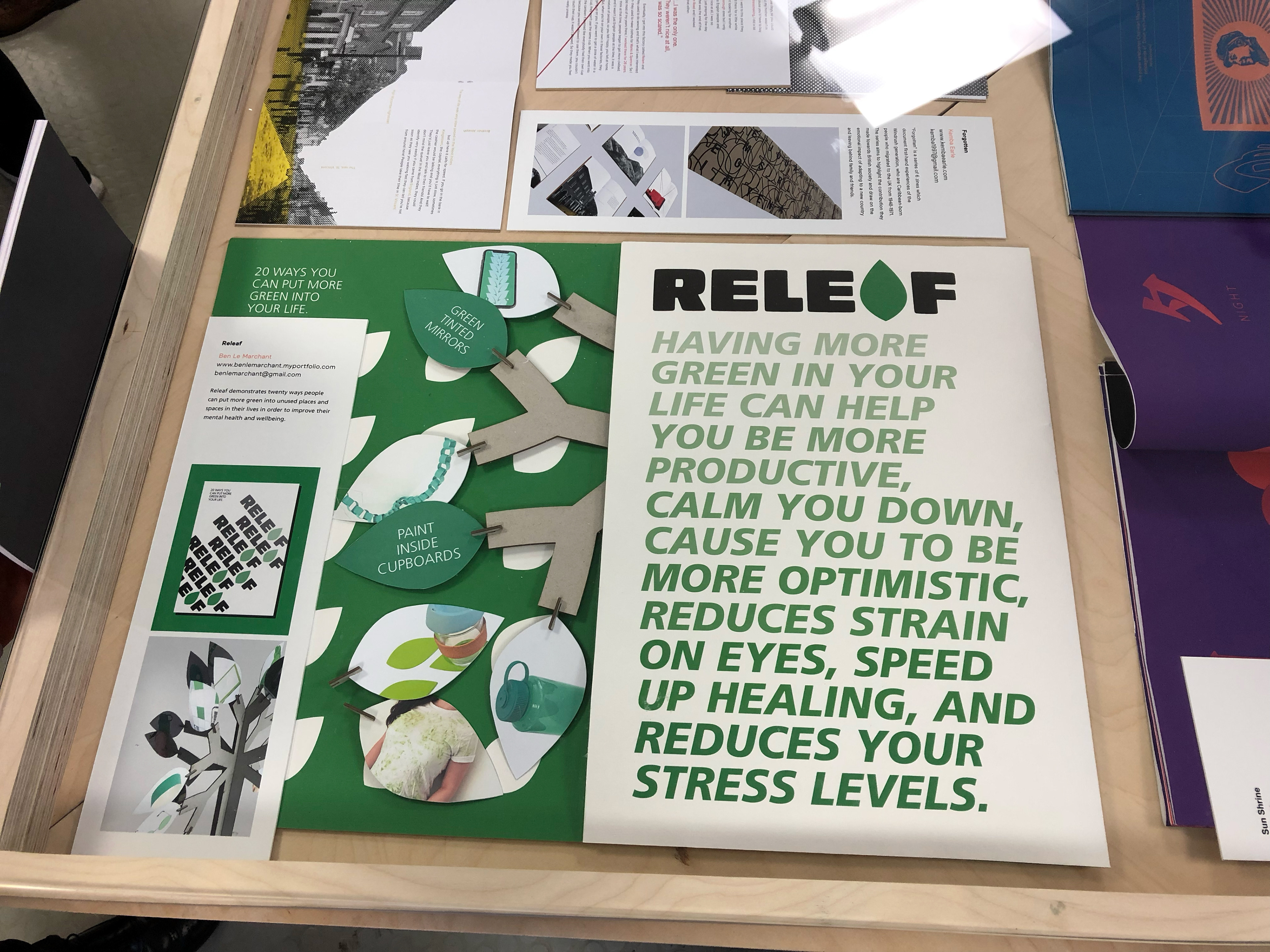 This project was the final project of my degree. Releaf demonstrates twenty ways people can put more green into unused places and spaces in their lives in order to improve their mental health and wellbeing.
